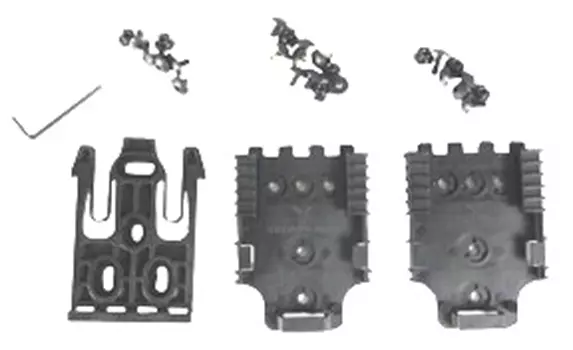 Set upínacího systému firmy Safariland, navržený pro pohodnou změnu pozice holsteru a jiného příslušenství. CLS Kit obsahuje dvě modulární platformy QLS 22L Receiver Plates a jednu zamykací vidlici QLS 19 Locking Fork